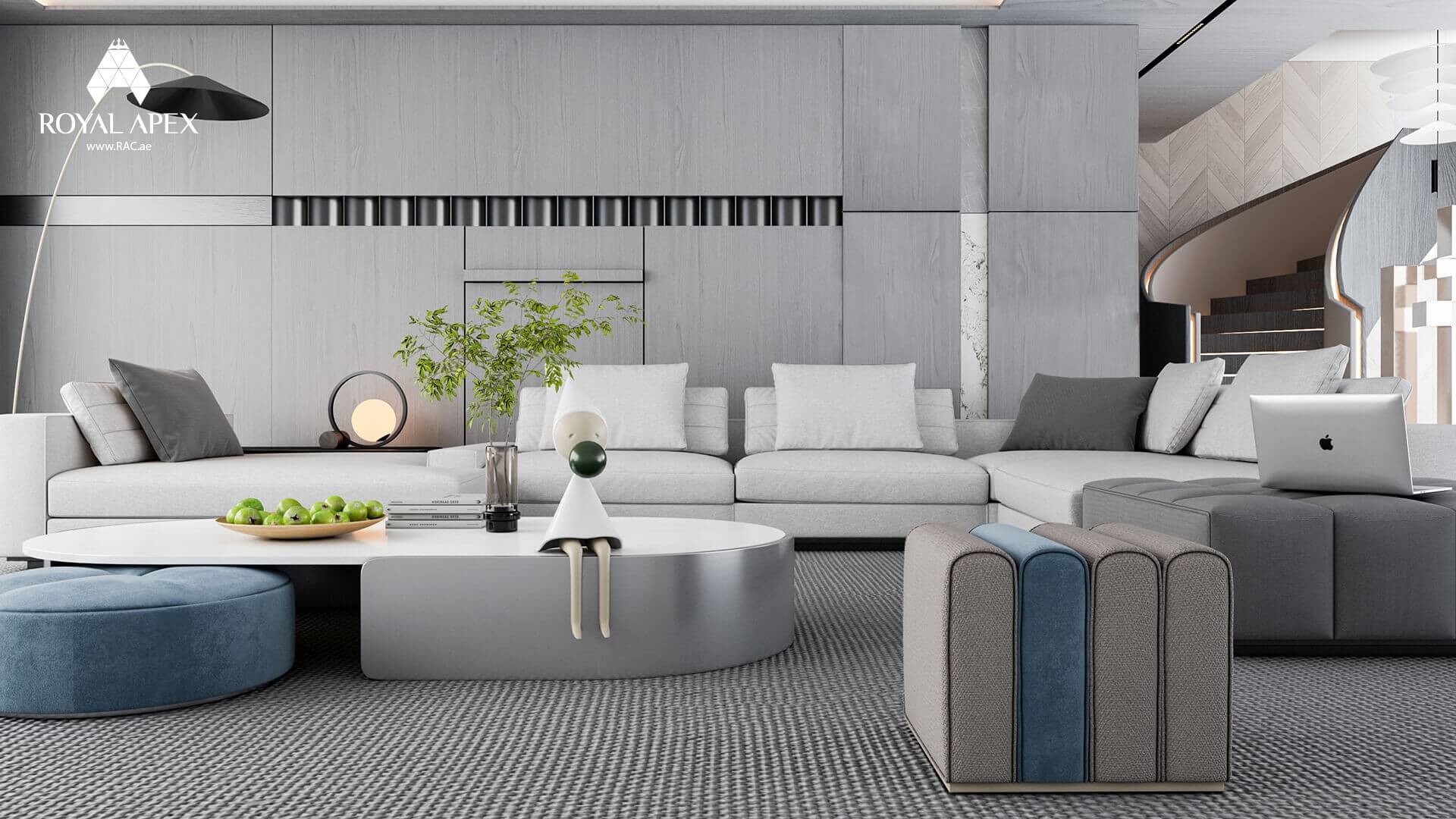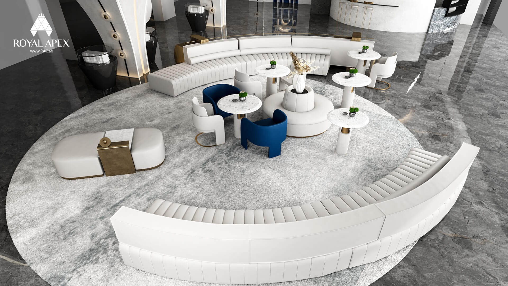 Step into luxury with our "Elegant Circular Lounge Retreat" project. This stunning 3D rendering showcases a spacious circular room adorned with sleek white couches and modern tables. The seamless design and meticulous attention to detail create an atmosphere of sophistication and relaxation. The combination of clean lines, soft hues, and inviting textures invites you to unwind and indulge in comfort. With Royal Apex's expertise in interior design, we can transform any space into a haven of elegance and tranquility. Explore the complete gallery to discover more captivating images of this remarkable project.