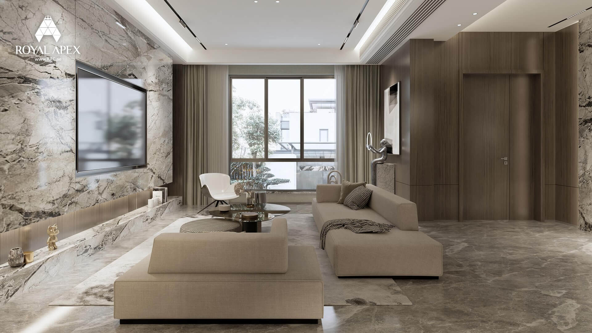 Step into luxury and elegance with our "Exquisite Marble Living Room." This stunning 3D rendering unveils a large living room adorned with magnificent marble walls and flooring. The opulent materials and meticulous craftsmanship exude a sense of grandeur. The spacious layout provides ample room for relaxation and entertainment. With Royal Apex's expertise in interior design, we transform living spaces into havens of sophistication. Explore the complete gallery to immerse yourself in the beauty of this remarkable project.