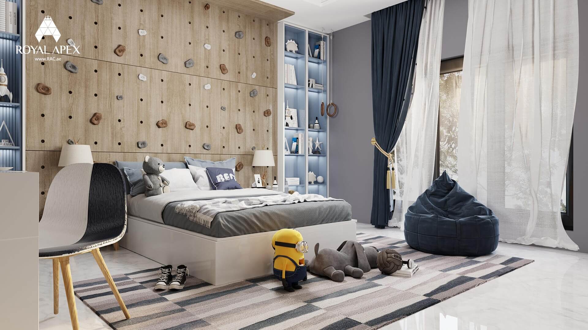 Unleash imagination and creativity in our "Playful Boys Bedroom Haven." This delightful 3D rendering showcases a boys bedroom with a cozy bed, a comfortable chair, and stuffed animals. The vibrant colors and playful elements create a cheerful and inviting space for your little one. With Royal Apex's expertise in designing spaces for children, we ensure a harmonious balance of comfort and functionality. Explore the complete gallery to see more captivating images of this enchanting project and envision a room where dreams come true.