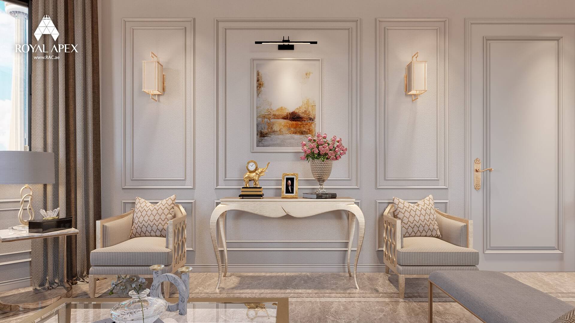 Immerse yourself in timeless elegance with our "Luxurious Classic Majlis Retreat." This opulent 3D rendering showcases a majestic living room filled with exquisite furniture and a grand window. The classic design elements, intricate detailing, and rich textures create a lavish ambiance. The abundant seating options invite intimate conversations and moments of relaxation. With Royal Apex's expertise in creating luxurious spaces, we bring a touch of grandeur to your living environment. Explore the complete gallery to witness more captivating images of this regal project.