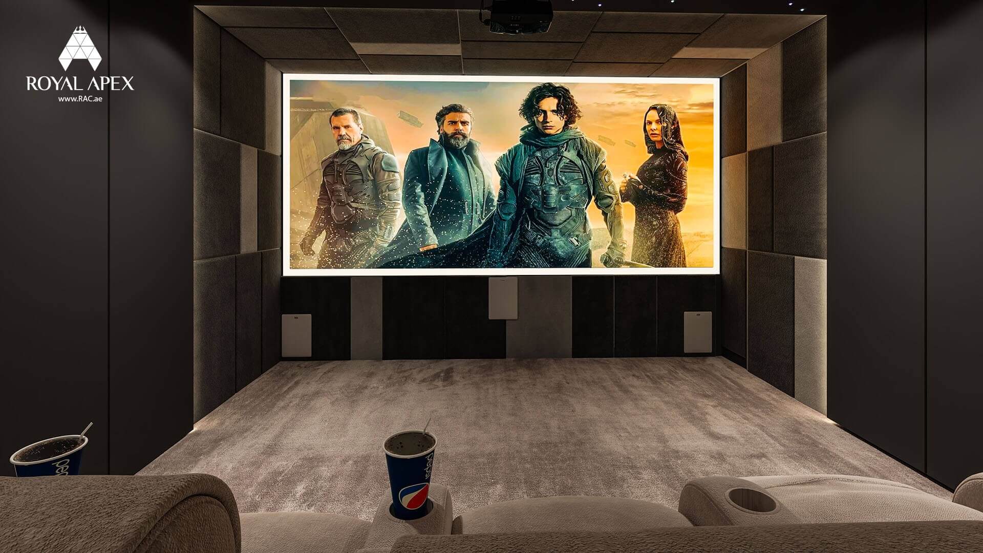 Step into the world of cinematic bliss with our "Ultimate Home Theater Experience." This captivating 3D rendering showcases a dedicated home theater featuring plush seats and a large projector screen. The meticulously designed layout and state-of-the-art audiovisual technology offer an immersive cinematic experience in the comfort of your own home. With Royal Apex's expertise in creating luxurious entertainment spaces, we transform your home into a haven for movie lovers. Explore the complete gallery to discover more images of this extraordinary project.