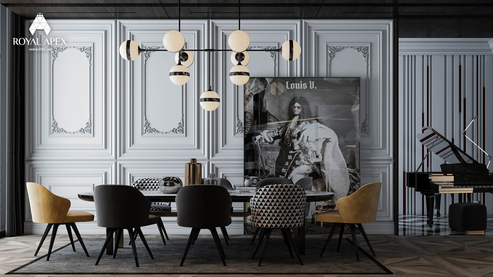 Indulge in a symphony of elegance and culinary delights in our "Sophisticated Dining Room Symphony." This 3D rendering unveils a dining room adorned with a beautiful table, chairs, and a captivating piano. The exquisite craftsmanship and meticulous attention to detail create a space that embodies refined taste and timeless charm. Whether it's hosting elaborate dinner parties or enjoying intimate family meals, this dining room provides the perfect setting for memorable experiences. With Royal Apex's expertise in designing sophisticated dining spaces, we create an ambiance where every meal becomes a cherished moment. Explore the complete gallery to envision the possibilities of this remarkable project.