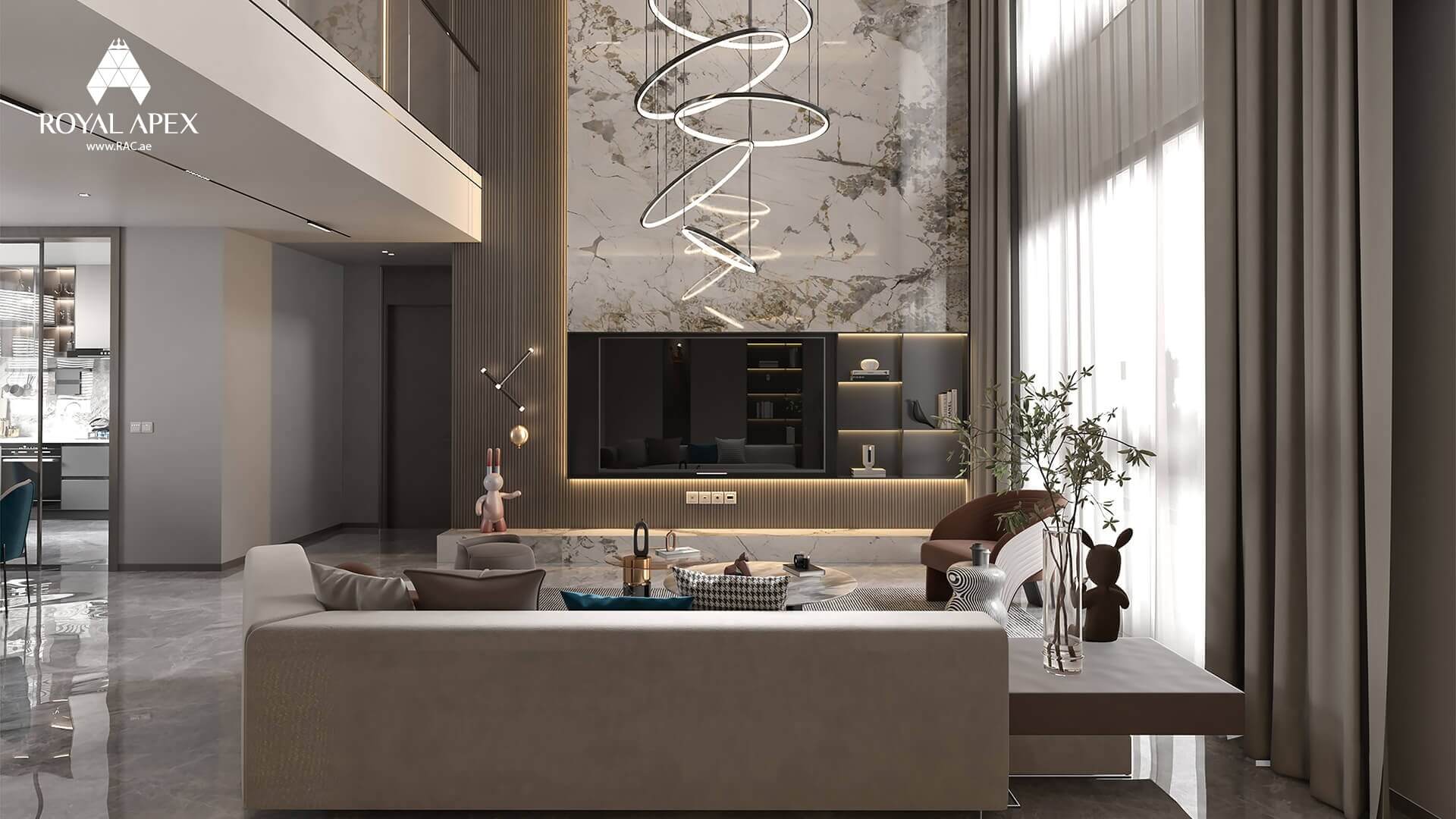 Immerse yourself in contemporary sophistication with our "Modern Luxury Living Room." This stunning 3D rendering unveils a space that seamlessly blends modern aesthetics with luxurious comfort. The sleek lines, exquisite materials, and attention to detail create an ambiance of refined elegance. Whether it's entertaining guests or enjoying quiet evenings, this living room exudes a sense of effortless style. With Royal Apex's expertise in creating modern living spaces, we transform your vision into a reality. Explore the complete gallery to discover more images of this extraordinary project.